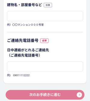 ①「商品の受け取り方法(や配送先情報)」、「連絡先」など画面に従って入力を進めます。